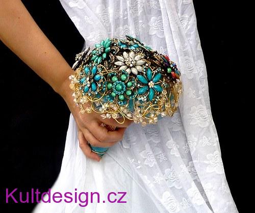 Brožová svatební kytice v tónech tyrkysové a zlaté doplněná jemnými barevnými akcenty, kytice je vzhledem k použitému materiálu poněkud těžší...