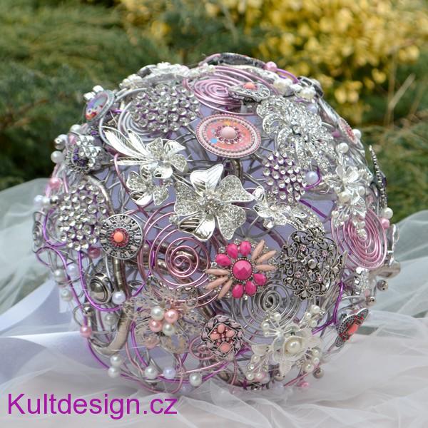 Kulatá svatební kytice pro originální nevěstu v kombinaci bižuterních komponentů.