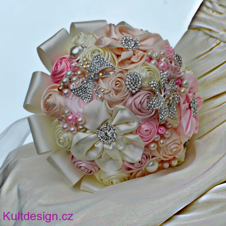 Kytice ze saténových květin a bižuterních komponentů jsou ve světě a zejména v Americe velkým trendem, je to možná i proto, že evokují luxus , eleganci a zůstanou navždy nevěstám jako krásná připomínka na jejich nejkrásnější den.