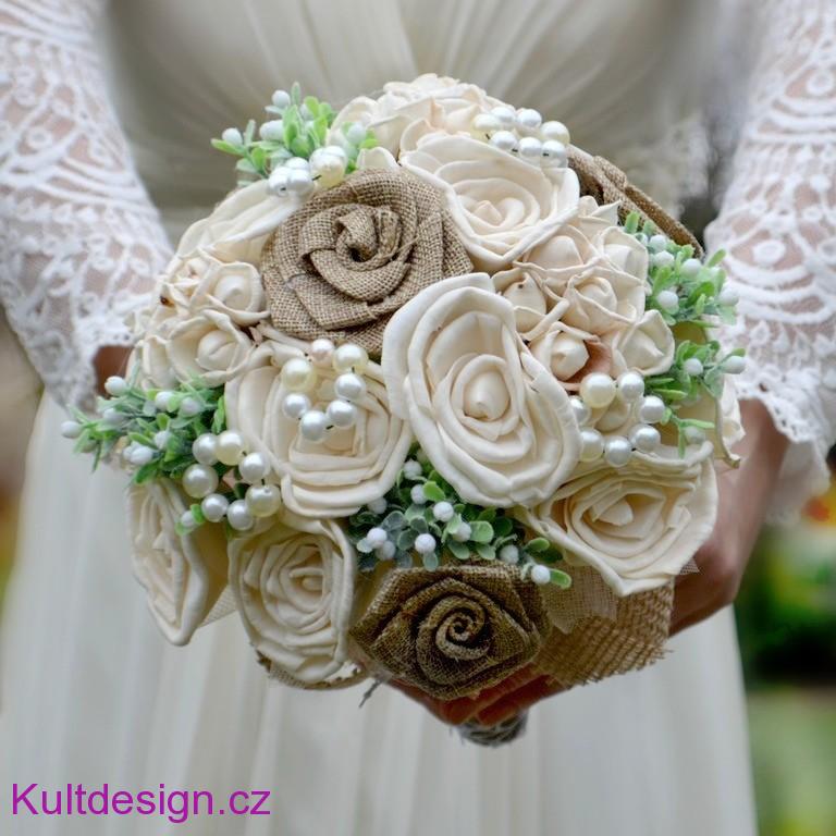 Svatební kytice z růžiček z přírodního materiálu, jutových růžiček a lehounce dozdobena umělými kvítky.