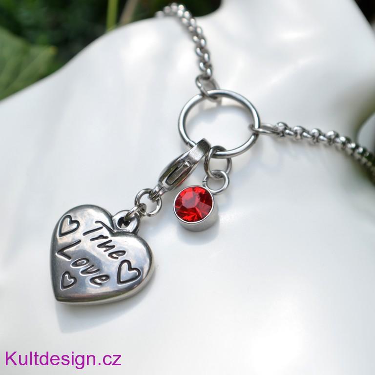 Náhrdelník s přívěskem True love ( Opravdová láska) na karabince , s malým něžným červeným kamínkem.