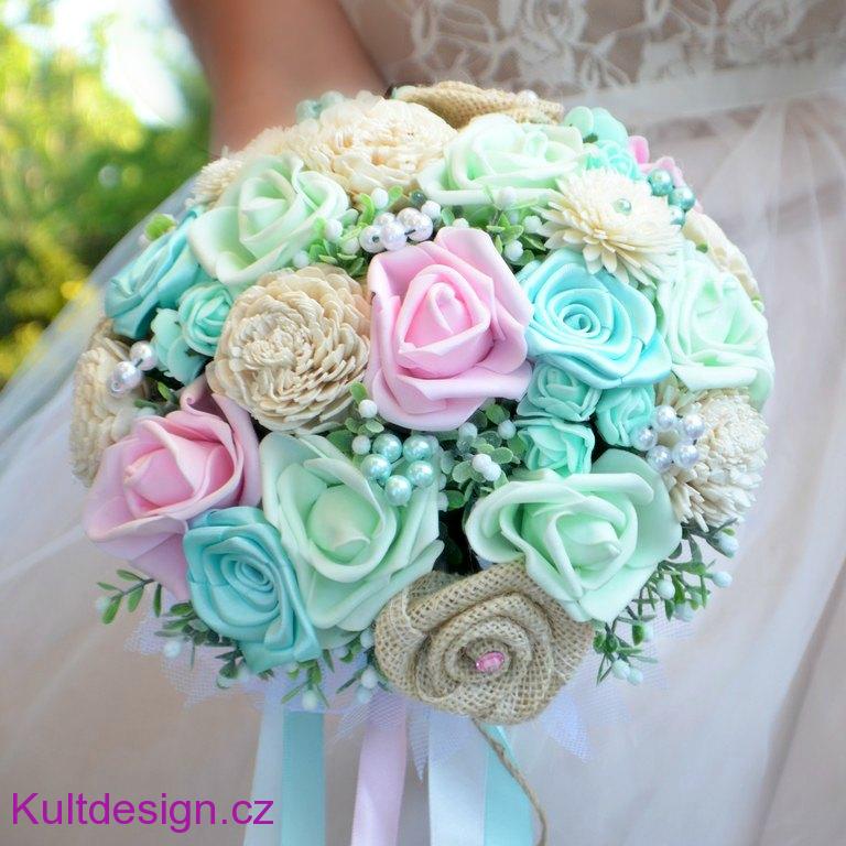 Svatební kytice z pěnových růžiček, umělých květin a přírodního materiálu v jemné pastelové kombinaci mint, ivory a růžové .