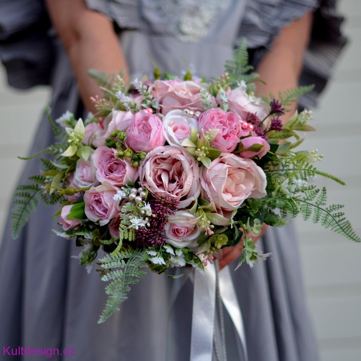 Svatební kytice z umělých květin v lehce rozcuchaném stylu