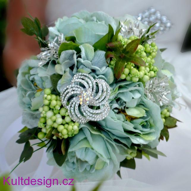 Svatební kytice v zajímavém modrošedém odstínu ze sametových růží, kytice je ozdobena broží a ozdobami ze stříbrných skleněných korálků.