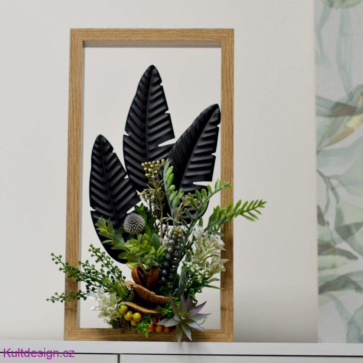 Sukulenty, kovové listy a stabilizovaný mech aranžované v masivním dřevěném rámu rámu, moderní styl